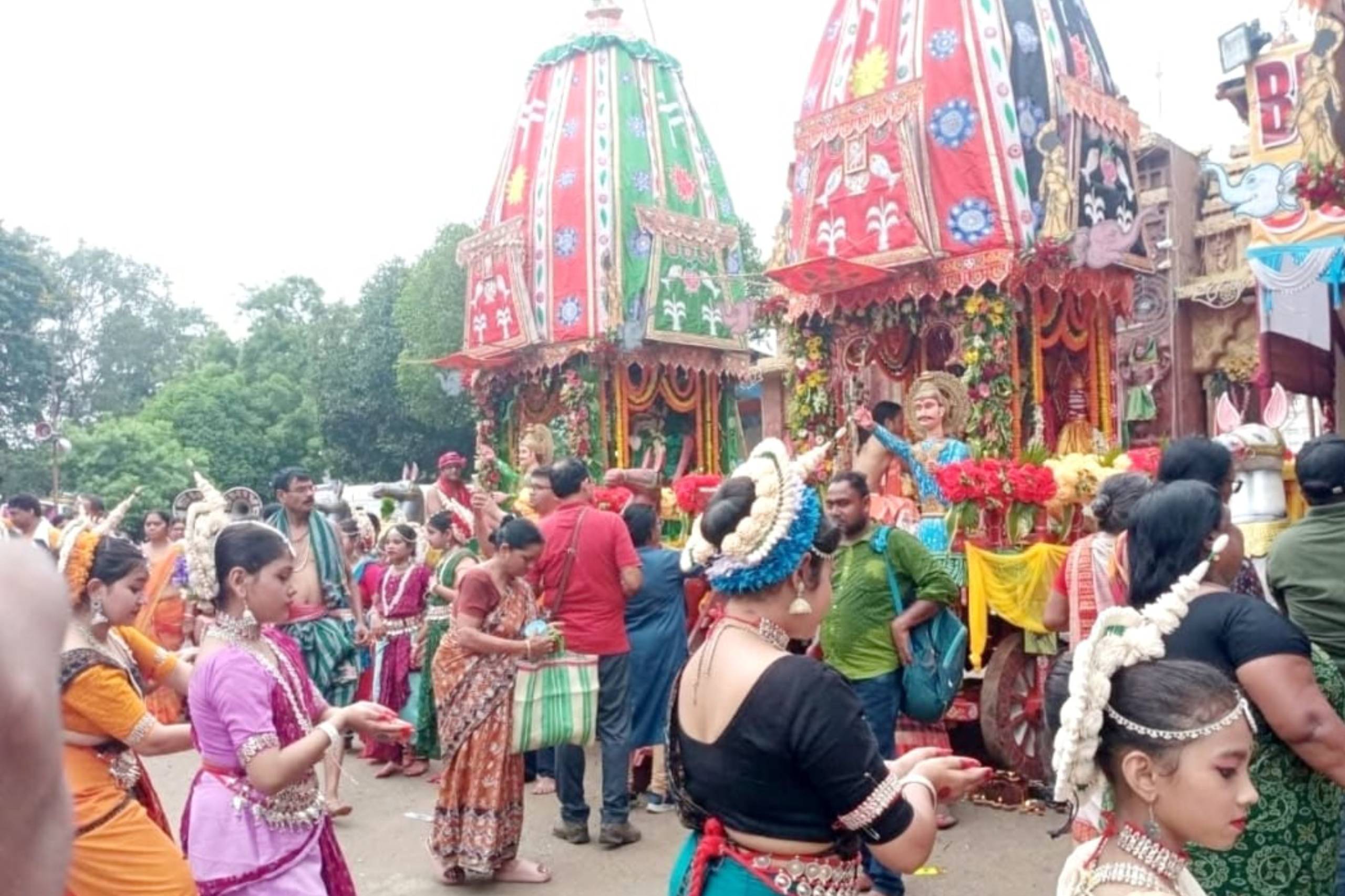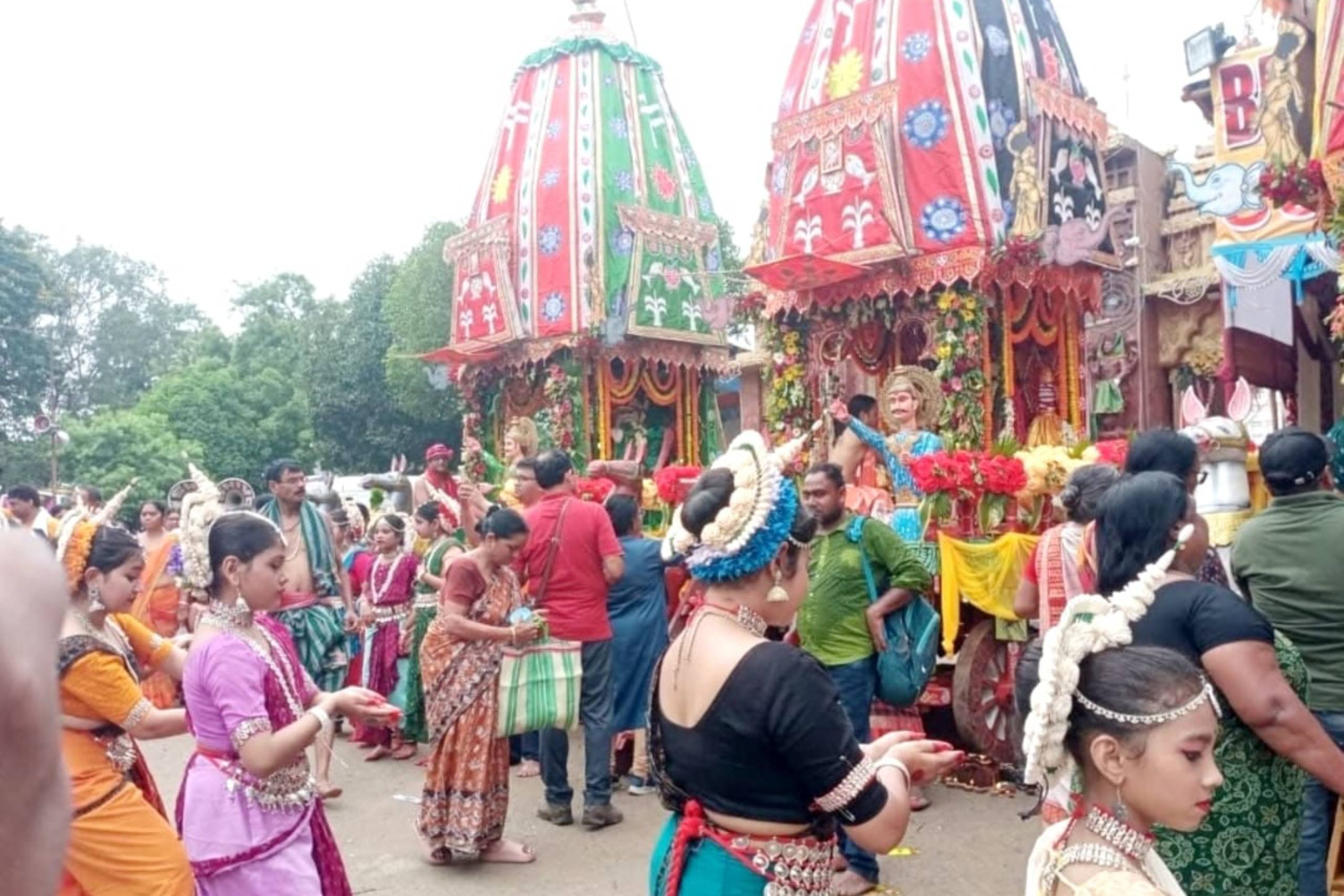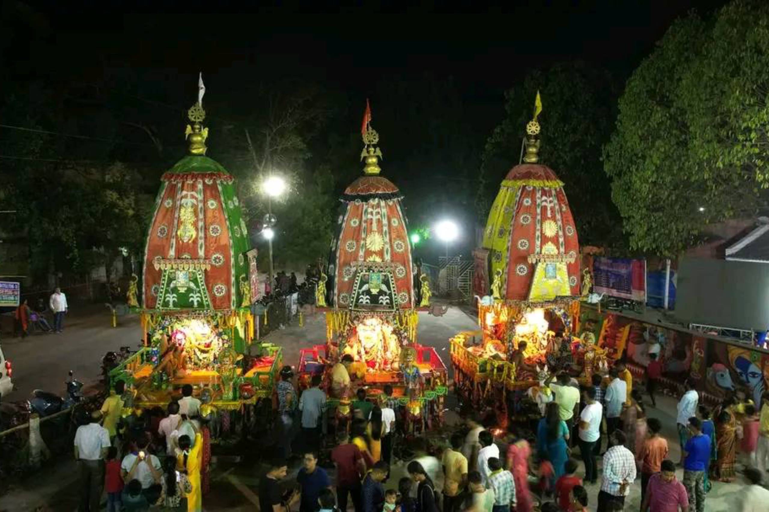 In the 1988, the Daru brahmas of the trinity it shreeBalavadra, Shree Jagannath & Devi Suvadra, were brought from puri on the sacred AkshayaTritiya day & installed in the temple with as bestos roof. The year 1988 also saw the starting of RathYatra with one chariot. With the rising aspiration of the devotees, in the year 2002, three new chariots were built from the deties. The RathYatra of 2002 saw the devotees pulling three chariots , To fulfill the wishes of female devotees, special arrangements were made from which the chariot of Devi Suvadra is being pulled by the female devotees since RathYatra of the year 2003. The year 2012 saw the golden jubilee celebration of RathYatra.