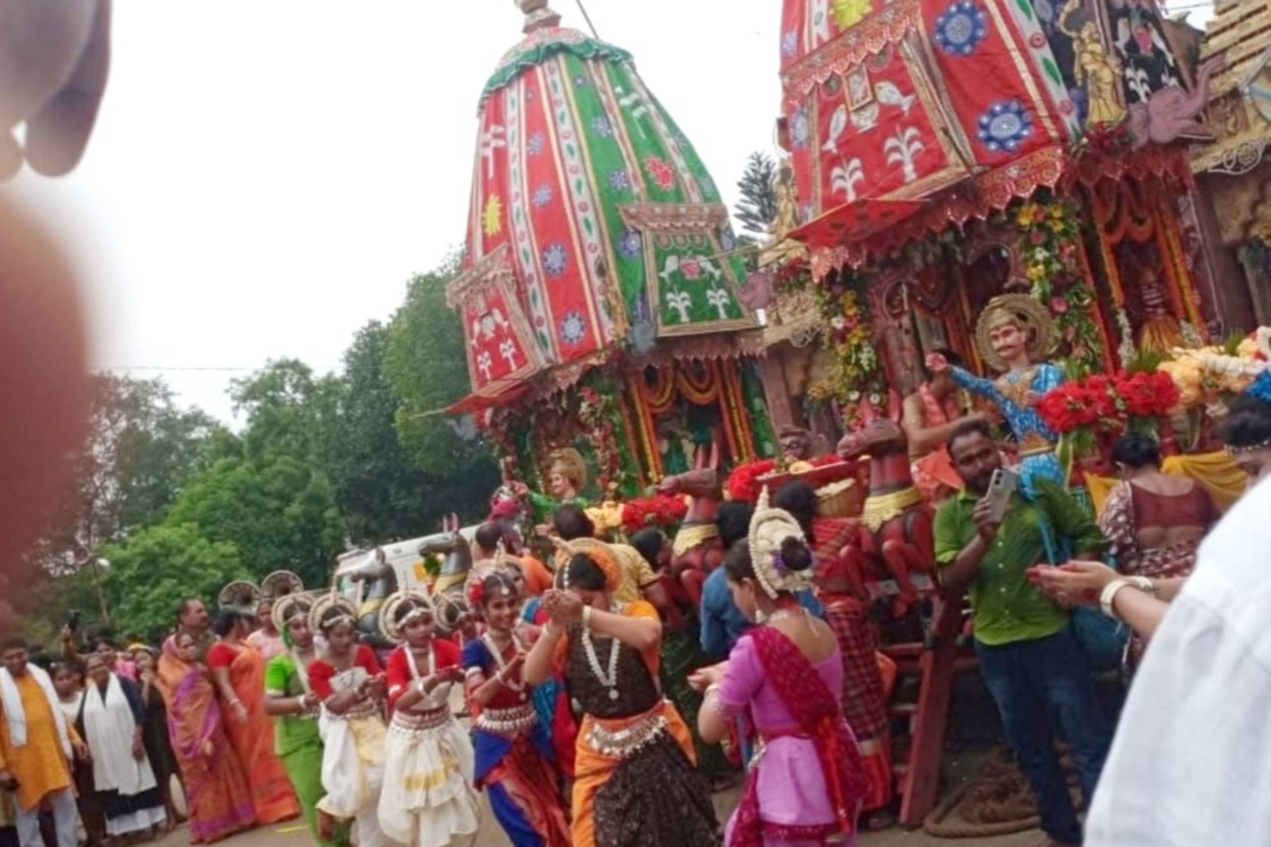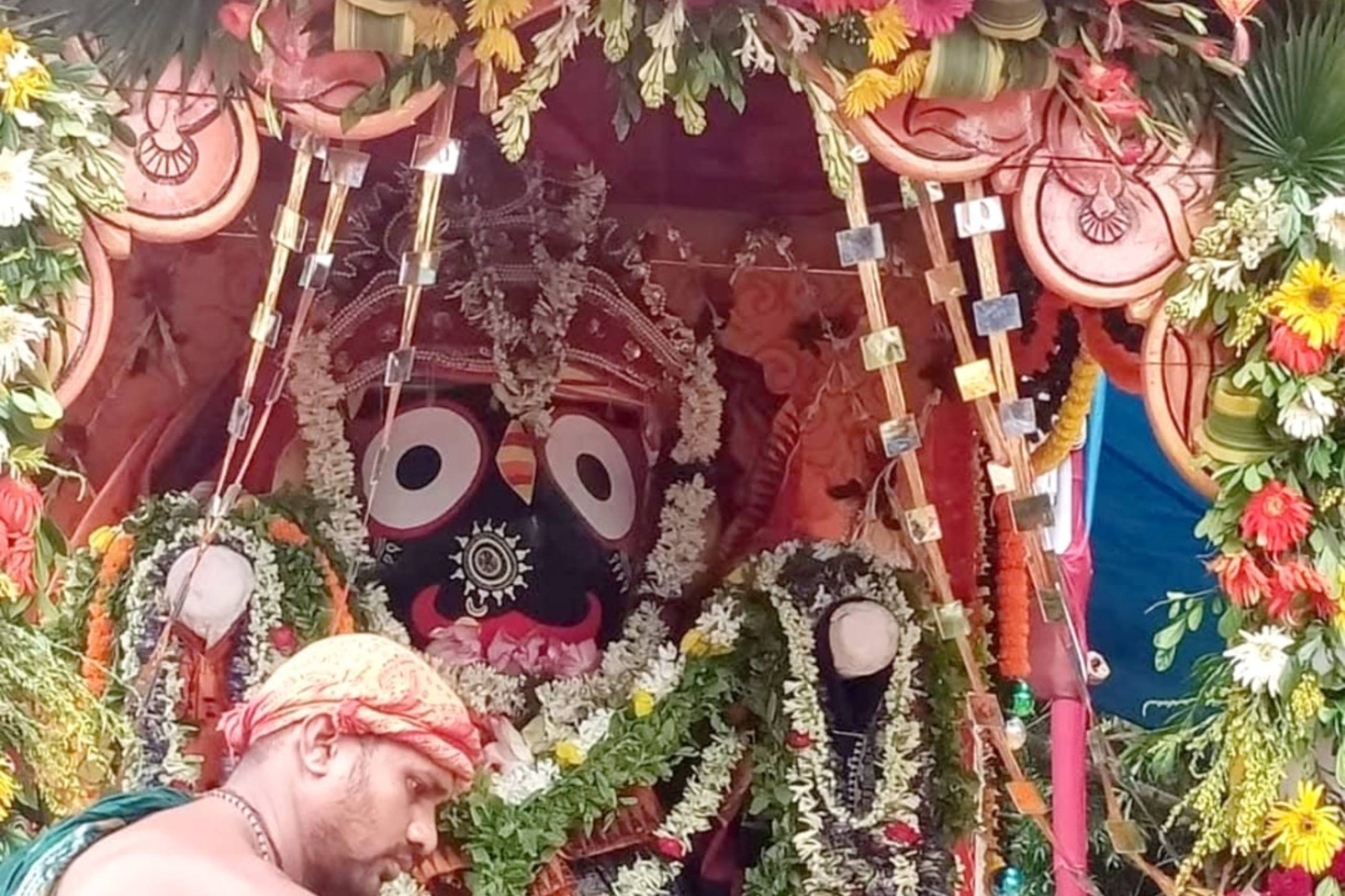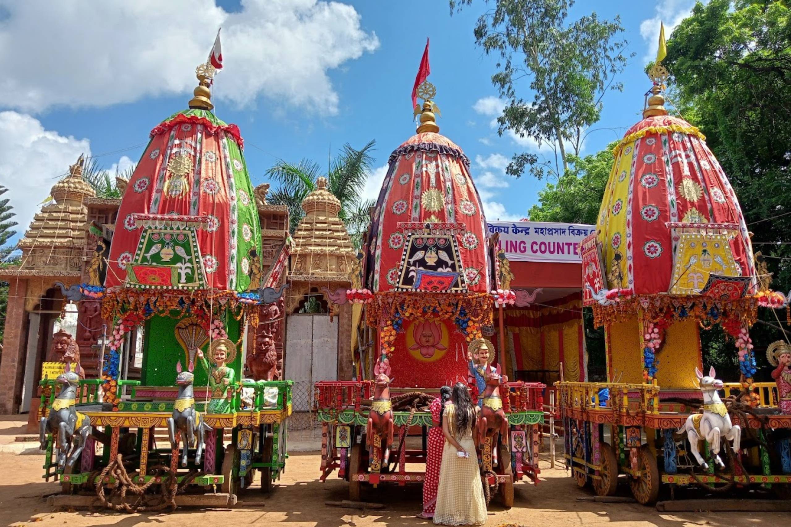 In the 1988, the Daru brahmas of the trinity it shreeBalavadra, Shree Jagannath & Devi Suvadra, were brought from puri on the sacred AkshayaTritiya day & installed in the temple with as bestos roof. The year 1988 also saw the starting of RathYatra with one chariot. With the rising aspiration of the devotees, in the year 2002, three new chariots were built from the deties. The RathYatra of 2002 saw the devotees pulling three chariots , To fulfill the wishes of female devotees, special arrangements were made from which the chariot of Devi Suvadra is being pulled by the female devotees since RathYatra of the year 2003. The year 2012 saw the golden jubilee celebration of RathYatra.